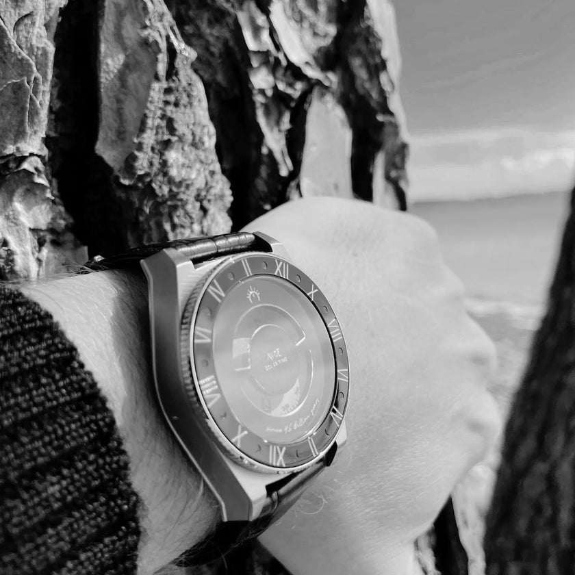 Placed flat on the wrist and oriented toward the sun, the watch enigmatic until that moment for the uninitiated comes to life. The compass needle aligns with the poles and points to the hour on the bezel.