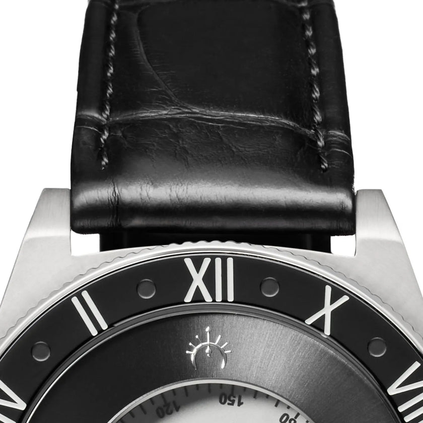 On the bezel, symbols: a crescent moon for unmeasurable nighttime hours, and a full disc representing the sun for measurable daytime hours.