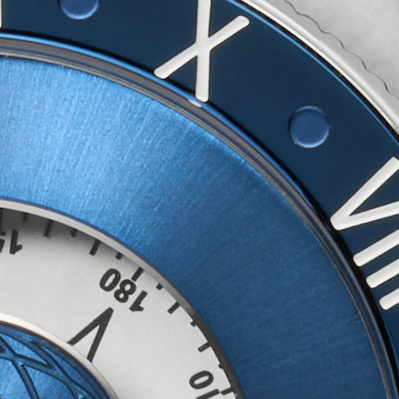 The Northern Hemisphere bezel indicates the time over 24 hours, in two twelve-hour cycles. Disconcerting at first, time moves counterclockwise, following the course of the sun from east to west.